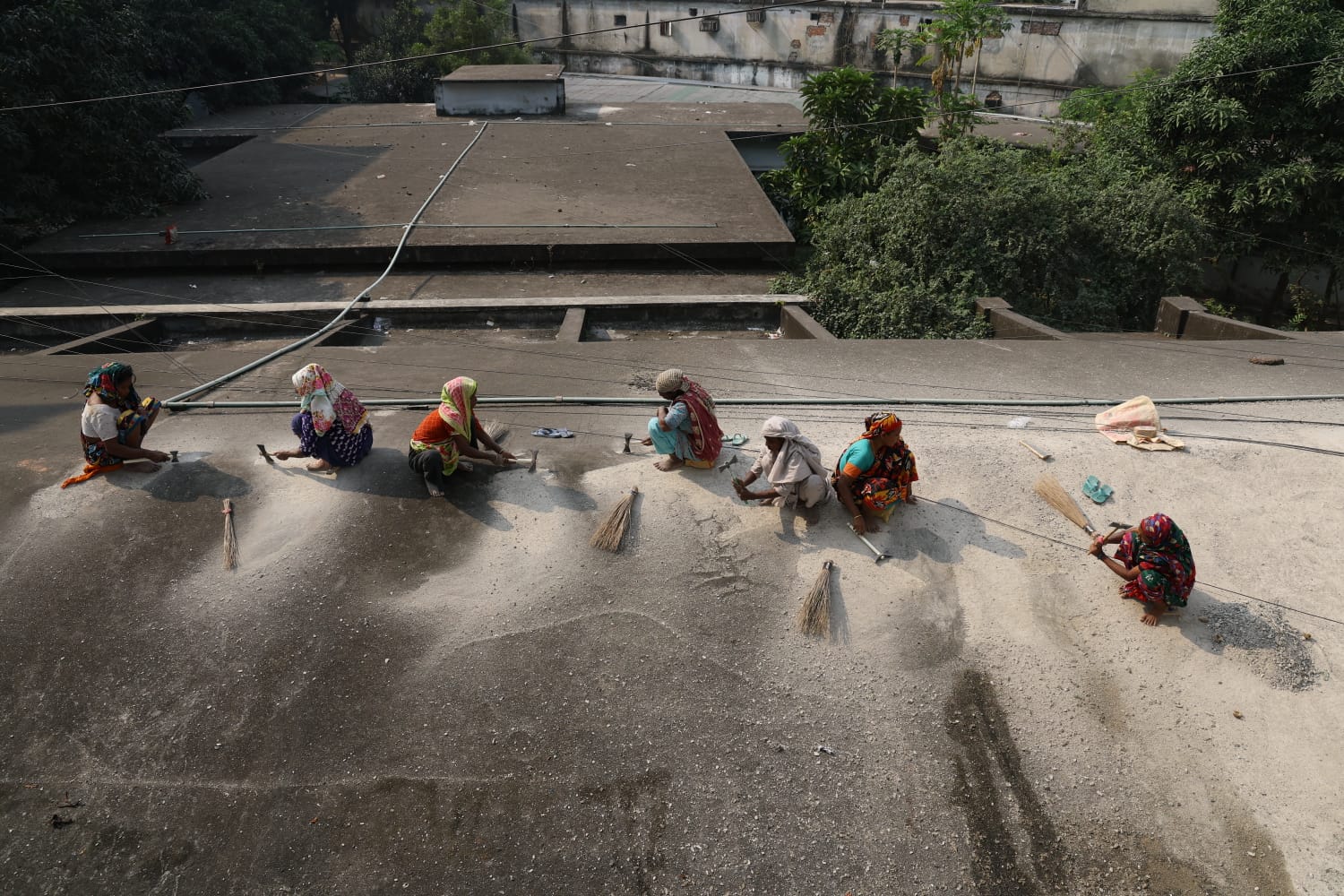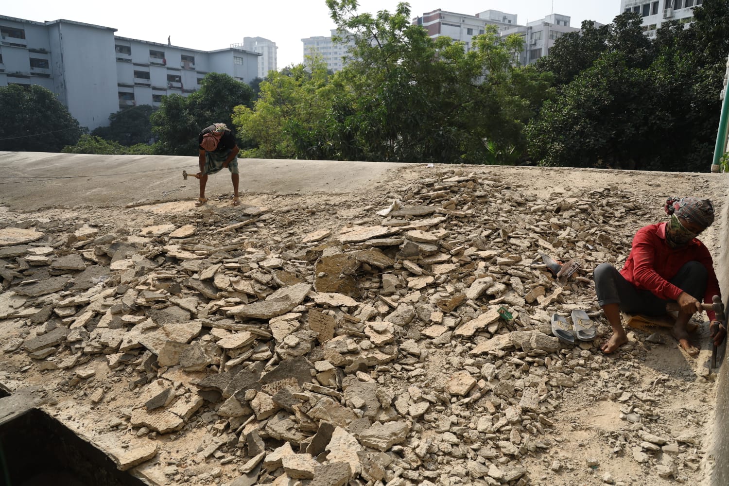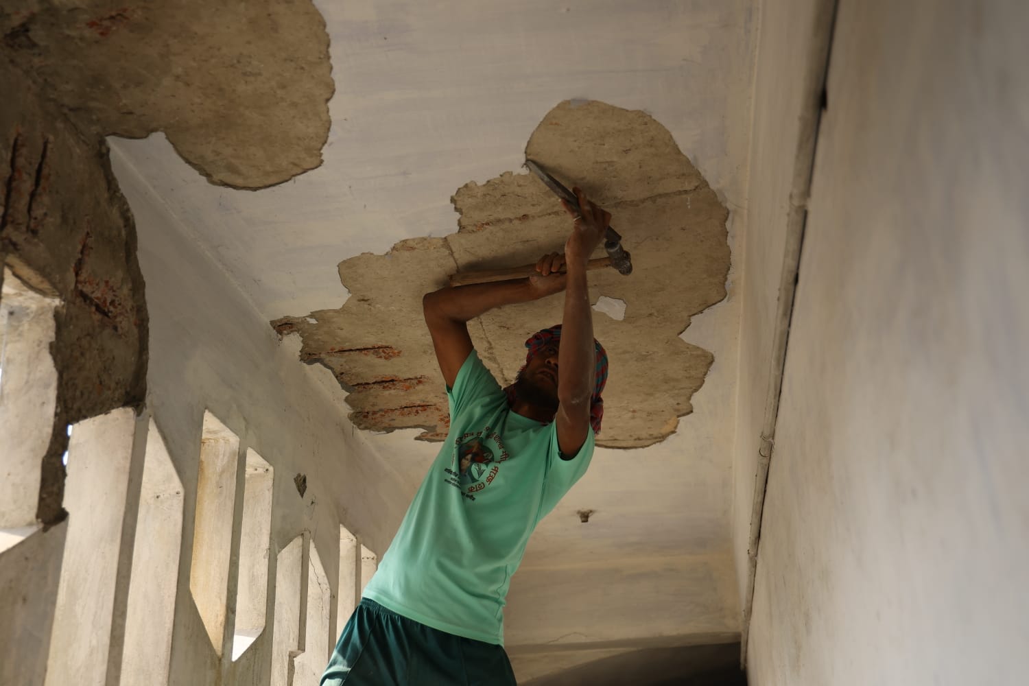 শিক্ষার্থীরা হল ত্যাগ করলে ঢাবি প্রশাসন ক্ষতিগ্রস্থ ভবনের মেরামত কাজ শুরু করে। ছবি: হারুন-অর-রশিদ