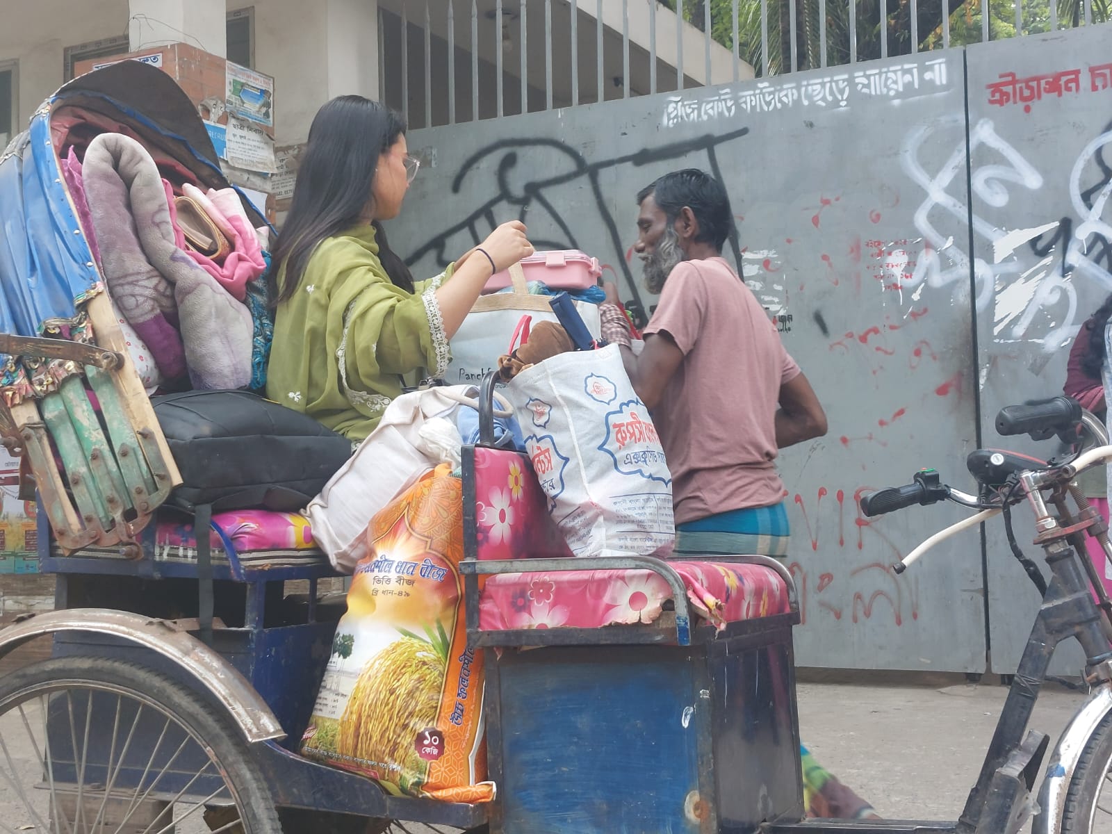 তল্পিতল্পাসহ হল ত্যাগ করছেন ঢাবি রোকেয়া হলের এক শিক্ষার্থী।